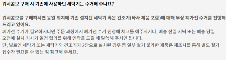 • 워시콤보 구매 시 기존에 사용하던 세탁기는 수거해 주나요?