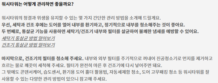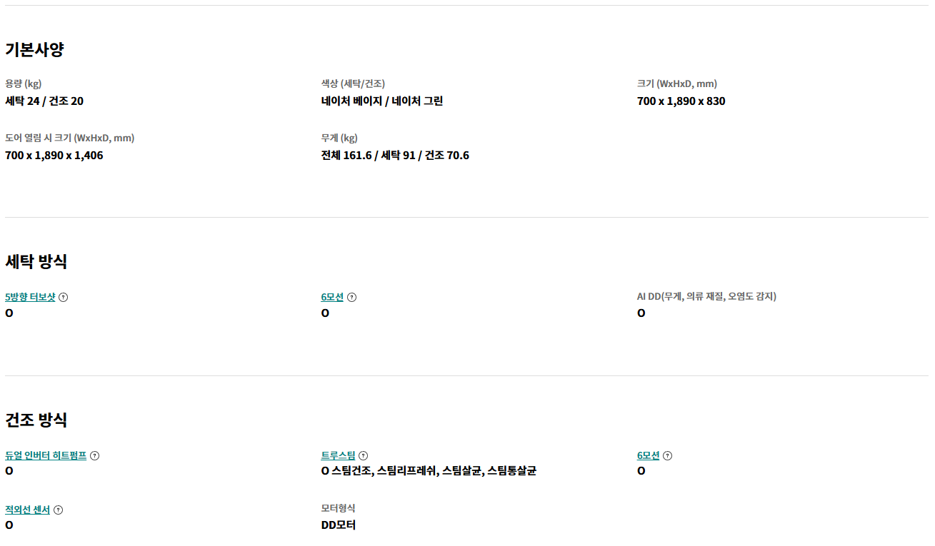 - 트루스팀 및 6모션 기능에 대한 만족도: 스팀 살균과 의류 손상을 줄이는 6모션 기능이 특히 인기를 끌고 있으며, 위생적인 세탁과 건조 효과에 많은 사용자가 만족하고 있습니다.