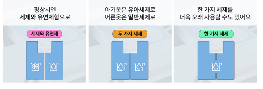 또한 세제와 유연제뿐만 아니라 유아세제와 일반세제, 한 가지 세제 등으로 사용하고자 하는 세제 종류를 사용자가 원하는 대로 설정하여 사용할 수 있습니다.