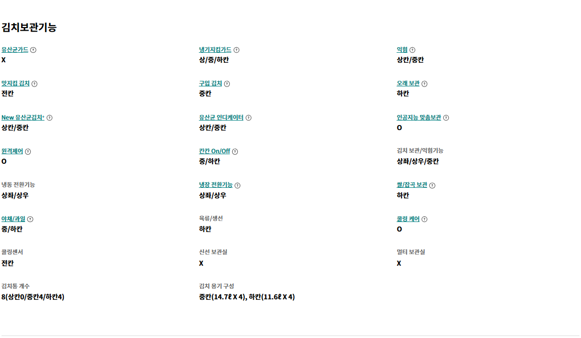 • 중/하칸: 대용량 수납이 가능하며, 계절에 따라 다른 식재료를 보관하기에 유용합니다. 이런 설계는 김치뿐만 아니라 육류, 생선, 과일, 채소, 잡곡 등을 각각의 온도에 맞게 보관할 수 있도록 돕습니다.