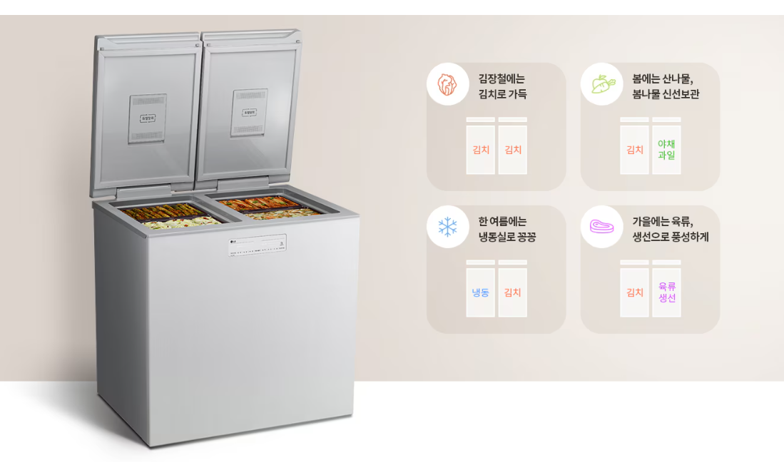 이 제품의 가장 큰 장점 중 하나는 냉동 기능으로 전환이 가능하다는 점입니다. 계절에 따라 김치 보관 공간이 줄어드는 여름철에는 냉동고로 활용해 다양한 식재료를 저장할 수 있습니다.