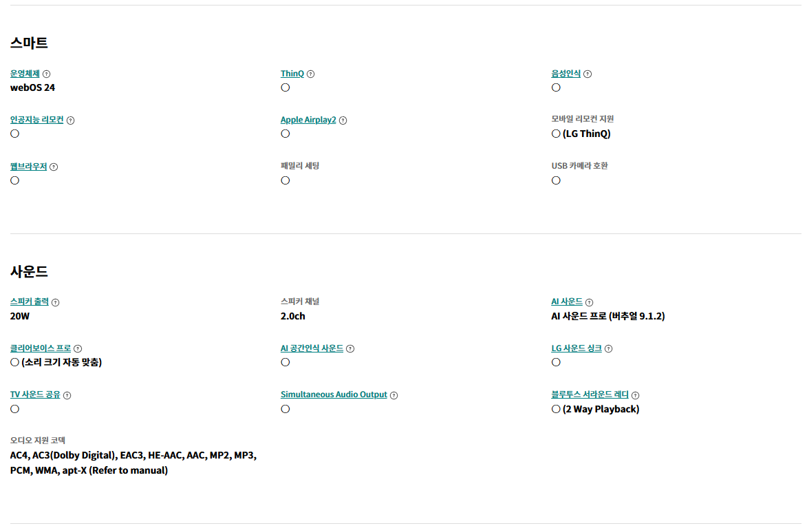 이 외에도 AI 사운드 프로, 버추얼 9.1.2 서라운드, webOS 24 등의 첨단 기능이 탑재되어 있어, 단순한 TV를 넘어선 스마트 홈 엔터테인먼트 기기로서의 역할을 수행합니다.