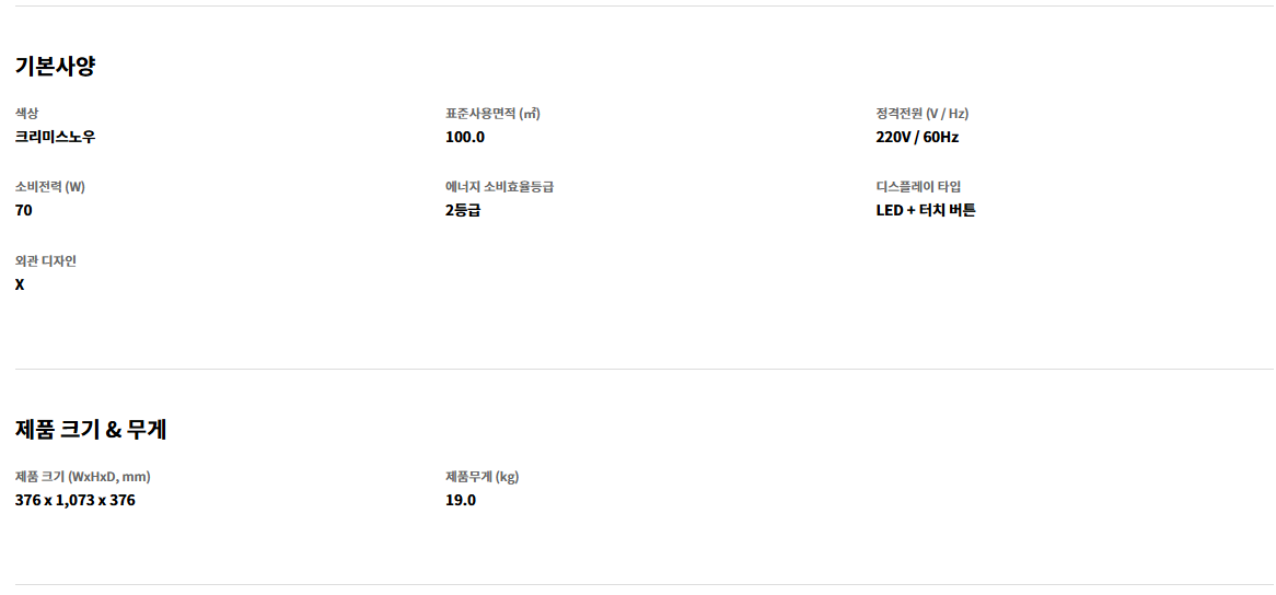- 주요 기능: AI 공기청정, 360˚ 클린부스터, 초미세먼지 및 유해가스 제거, 스마트 앱 연동