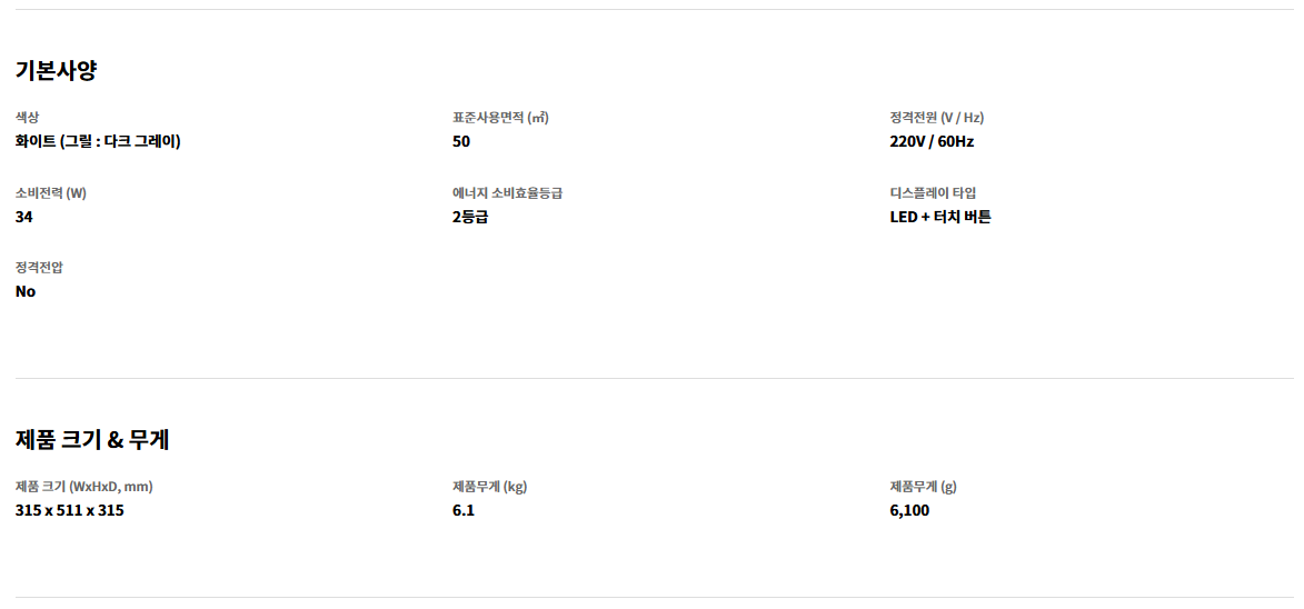 제품 스펙(출처:LG전자 공식 홈페이지)