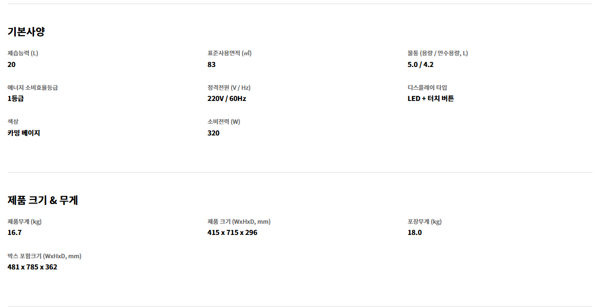 동급 20L 제품과 비교했을 때 전기료 절감 효과가 크고, 자동 건조 및 살균 기능이 탑재되어 있어 더욱 위생적으로 사용할 수 있는 점이 차별점입니다.