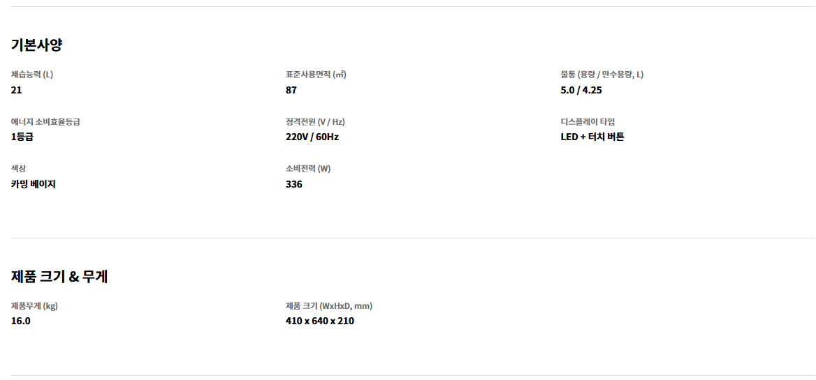 제품 스펙(출처:LG전자 공식 홈페이지)